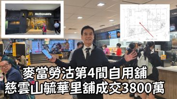 今日新聞,第5311成交,「台灣張」3800萬購慈雲山麥當勞自用舖。感覺8分,國際知名連鎖快餐店麥當勞,近月先後售出多個自用舖,最新一個為慈雲山毓華街68號萬年戲院大廈地舖,面積6746方呎,上月初以3800萬元售出,呎價5633元,較麥當勞總公司1993年購入價2100萬元帳面獲利1700萬元,賺幅約8成。...