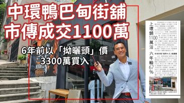 今日新聞:六年前3300萬買入,上環鴨巴甸街舖價跌至1100萬沽,狂蝕七成 中西區商業舖位傳出沽售消息,上環鴨巴甸街金豪大廈商舖,最近以1,100萬售出,原業主持貨6年,終以蝕2,200萬元離場,帳面大蝕67%。...