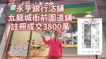 (字幕) 永亨銀行沽舖。今日註冊:第5418成交,註冊成交港幣3,800萬,感覺6.5分,九龍城衙前圍道37號地下,建築面積約1600呎,實用面積約1300呎,門闊約20呎,深約70呎,租客佳記