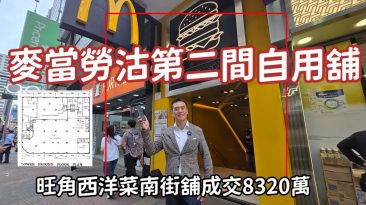 今日註冊,第5286成交,註冊成交港幣8,320萬,感覺7分,旺角彌敦道612-618號好望角大廈地下及地庫1A&4號舖,註冊成交港幣8,320萬,樓齡54年。位於西洋菜南街5至19號地庫的麥當勞舖位,面積約7357平方呎,由麥當勞集團持有,並以月租約47.4萬元租予擁有香港麥當勞經營權、由中信股份及麥當勞等組成的合資公司。...
